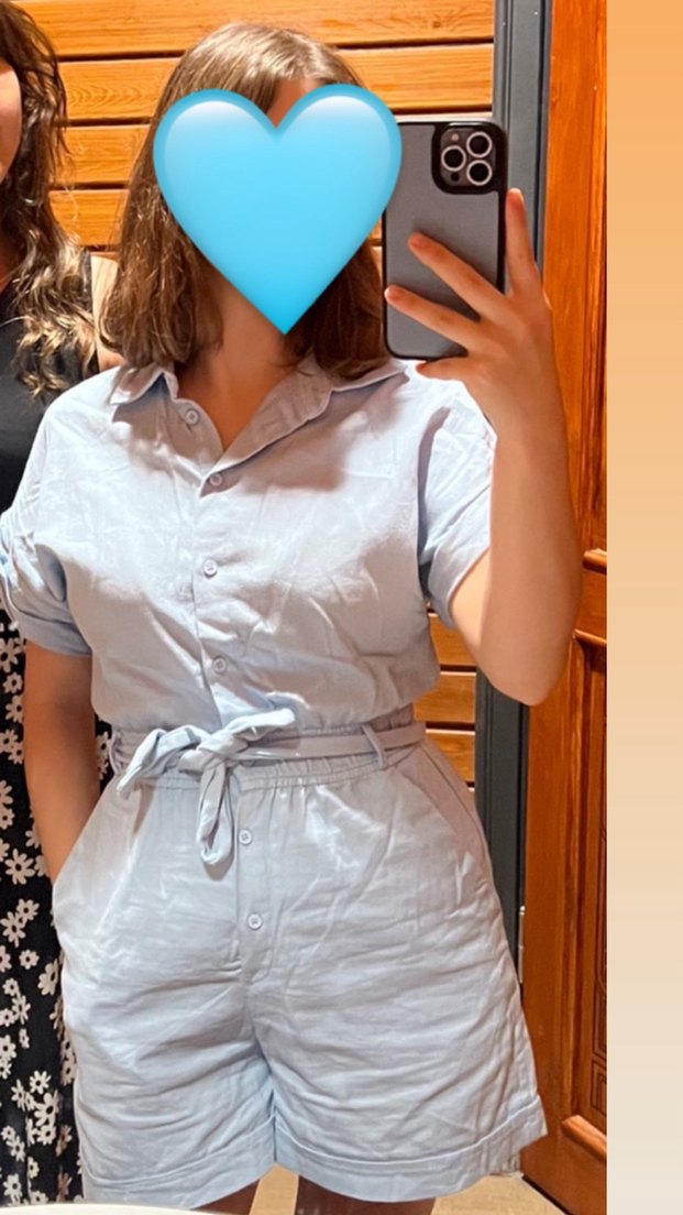 Mavi keten kumaştan, kısa kollu, yakalı ve düğmeli midi uzunlukta, belden bağlamalı, rahat kesim tulum.