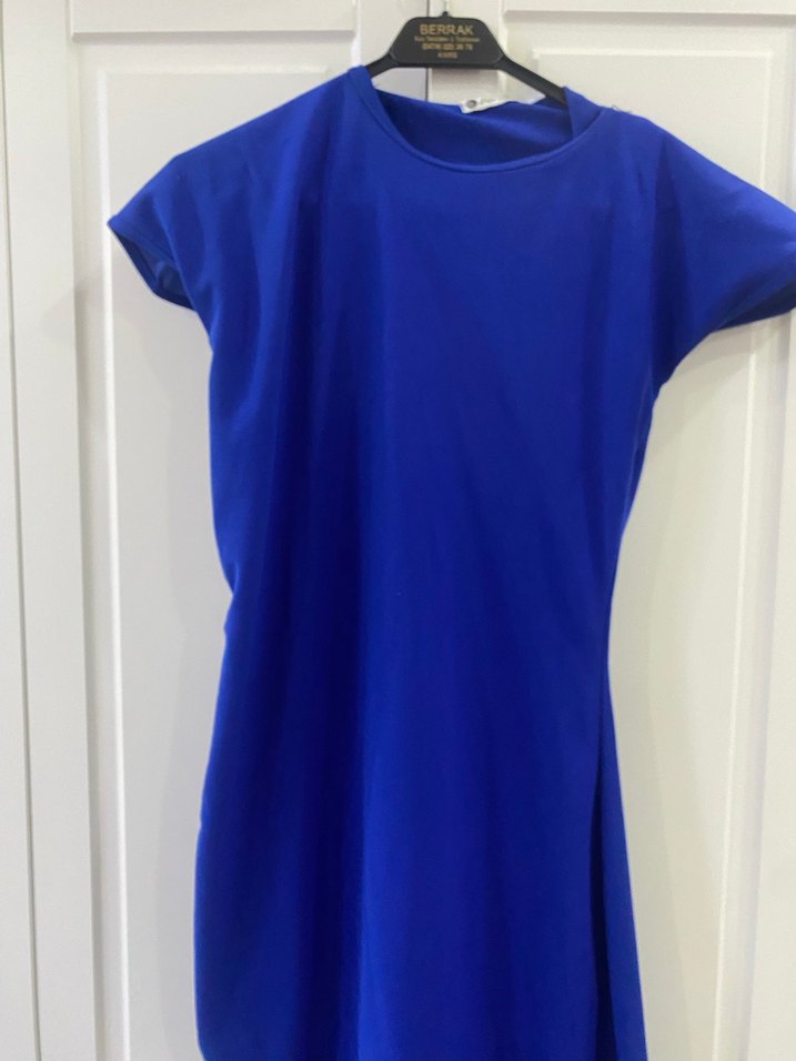 Düz renkli mavi midi elbise, kısa kollu ve yuvarlak yakalıdır. Sentetik kumaştan üretilmiş, rahat ve şık bir sokak stili için uygundur.