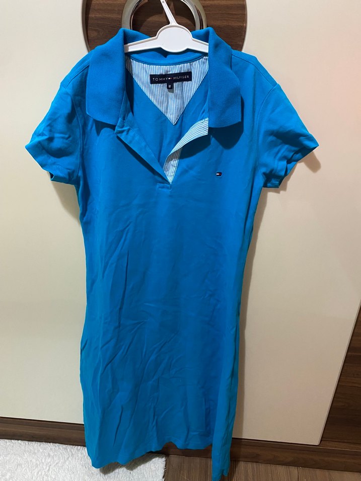 Mavi renkte, kısa kollu ve düğmeli detaylı, yakalı midi elbise. Sentetik kumaştan, rahat ve sokak stiline uygun.