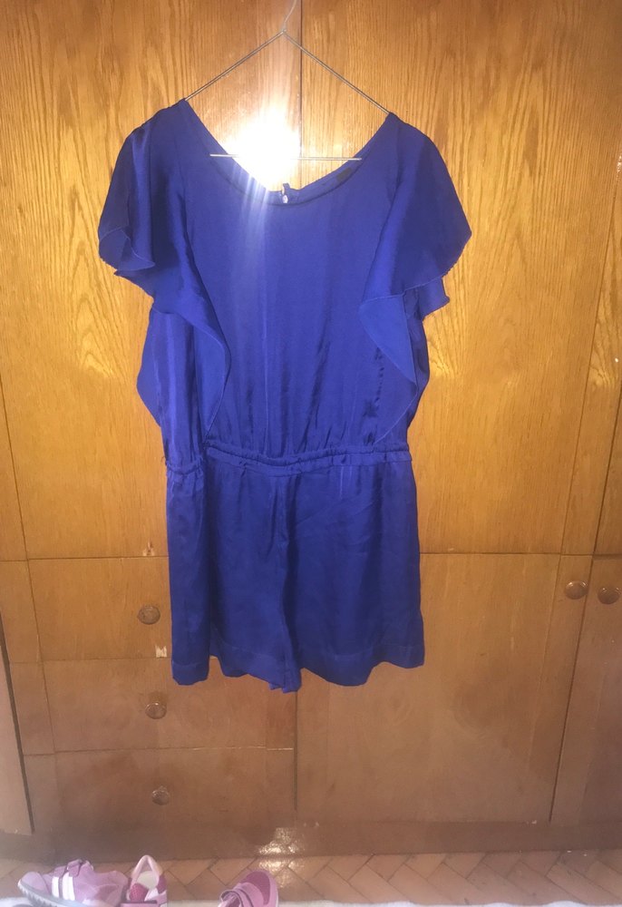Mavi renkli, kısa kollu, yuvarlak yakalı, dökümlü detaylara sahip, bol kesim midi kadın tulumu. İpeksi kumaştan, parti için uygun. ✨