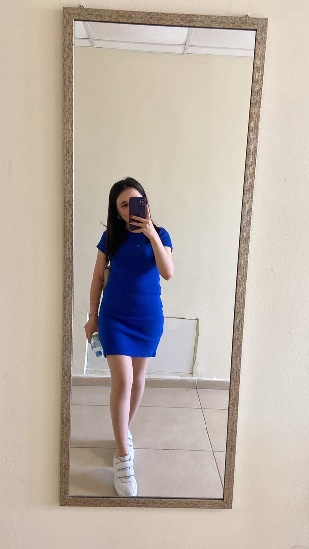 Bu dar kesim açık mavi denim elbise, yüksek yakalı ve kısa kolludur. Minimalist, normcore tarzıyla günlük kullanıma uygundur, şık ve rahat bir görünüm sunar.