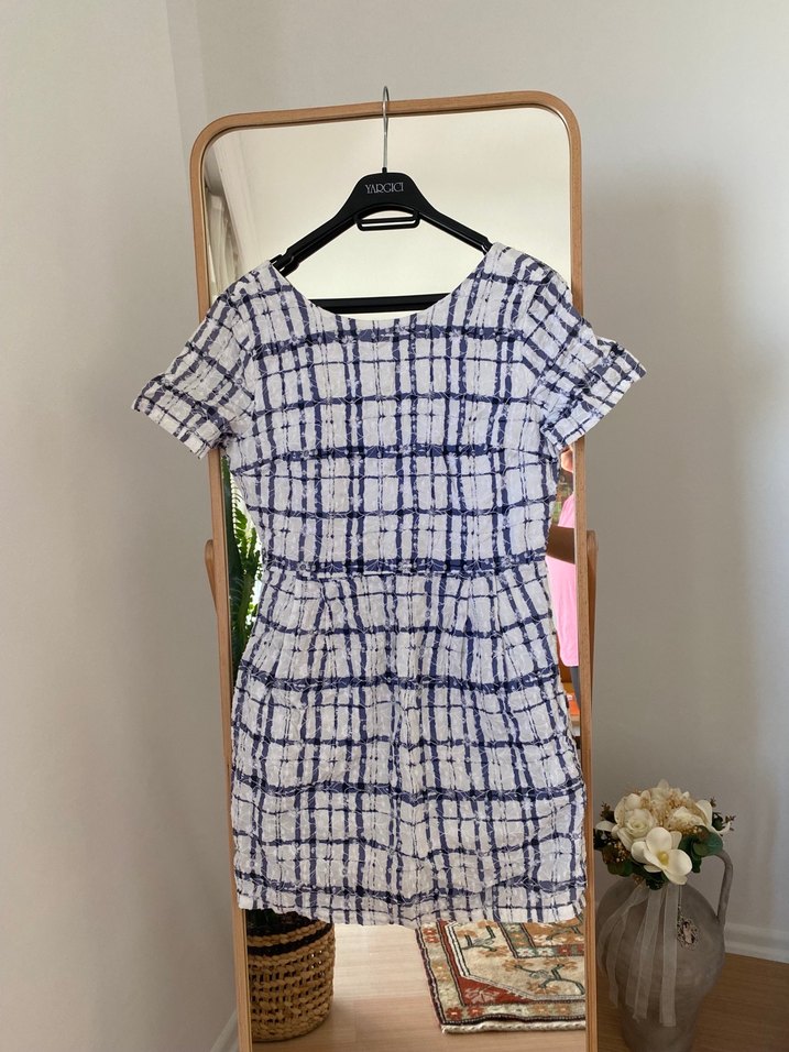 Mavi renkli, kısa kollu mini elbise ve tekne yakalıdır. Regular fit kesimi ve günlük kullanıma uygundur. Birkaç lekesi mevcut çıkar mı bilmiyorum bedeni olmadığı için satıyorum