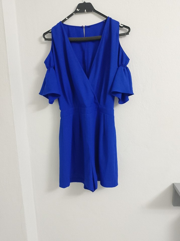 Mavi renkte, kısa kollu ve V yaka tasarıma sahip, bol kesim mini tulum. Drapeli detayları ve yumuşak, sıcak kumaşıyla günlük kullanıma uygundur.
