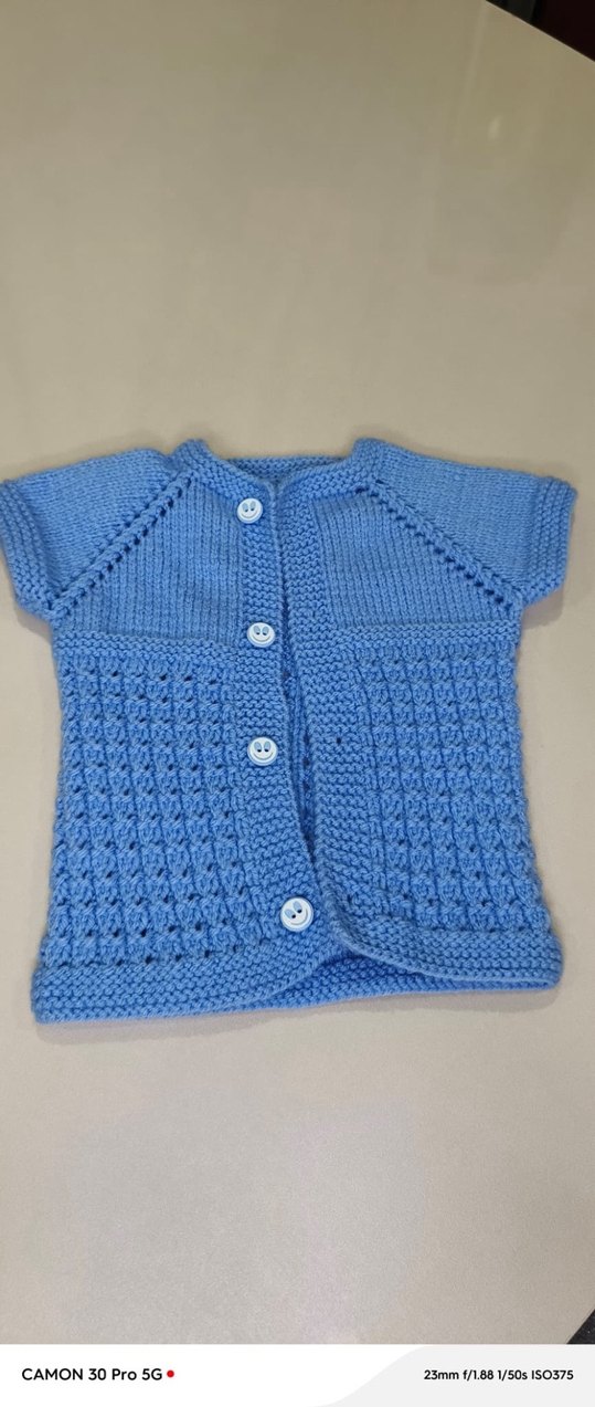 Fitted kesim, kısa kollu, canlı mavi renkte örgü erkek hırka. Düğmeli ve desensiz sade tasarıma sahiptir. 2 yaşa kadar uygundur