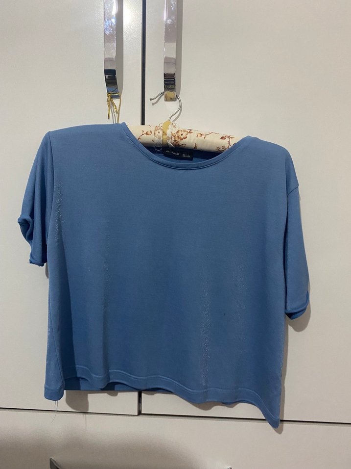 Mavi denim kısa kollu tişört, yuvarlak yaka ve bol kesim ile rahat sokak stili sunar. Normal boyda ve desensiz, günlük kullanım için uygundur.