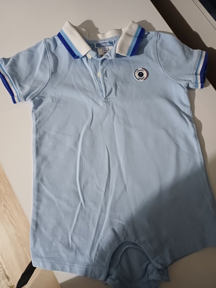 Pamuklu, kısa kollu, düğmeli, yakalı mavi erkek bebek tulumu. Pastel tonlarda baskılı tasarım, rahat sokak stili için uygun.