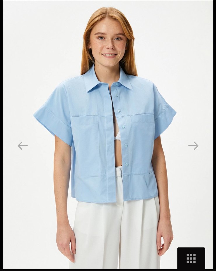Pamuklu, pastel mavi renkte, kısa kollu, yakalı ve düğmeli, bol kesim gömlek. Günlük rahat kullanım için uygundur. Koton 42 beden kısa kollu gömlek 44 bedene kdar uyumludur .toplamda 3-4 kez kullanılmıştır