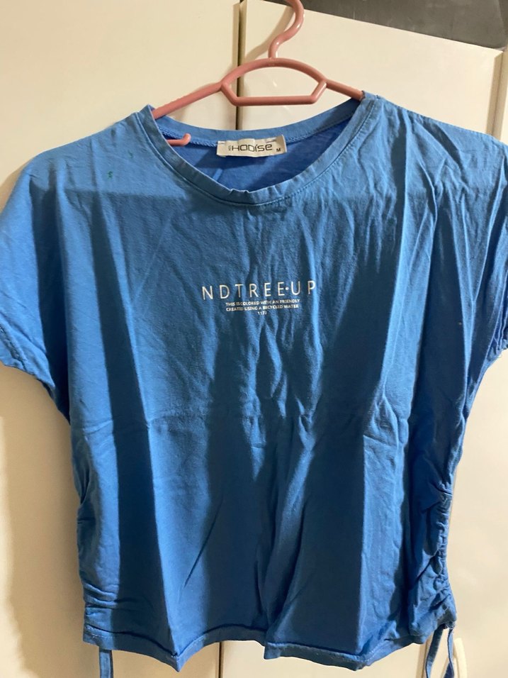 Mavi renkte, kısa kollu, rahat kesim keten kumaştan tişört. Üzerinde "NDTREEU" yazılı baskı bulunur, gündelik şıklık sağlar