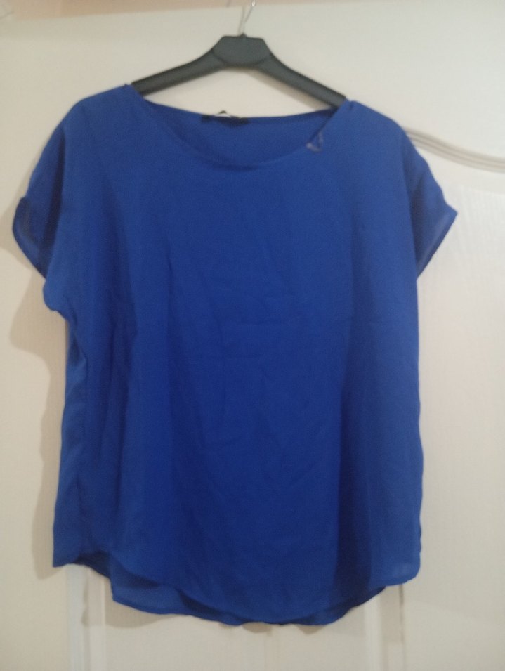 Mavi renkli, kısa kollu, yuvarlak yakalı şifon gömlek Salaş kesimi ve normal boyu ile günlük kullanıma uygun, parlak dokusu şık bir hava katıyor. hiç kullanılmadı sorunsuz