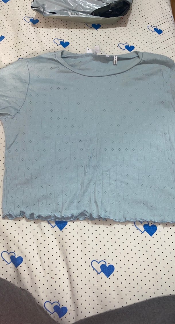 Pastel mavi renkli, kısa kollu, yuvarlak yaka. Pamuklu kumaştan, sade ve basic tasarım günlük kullanıma uygun.