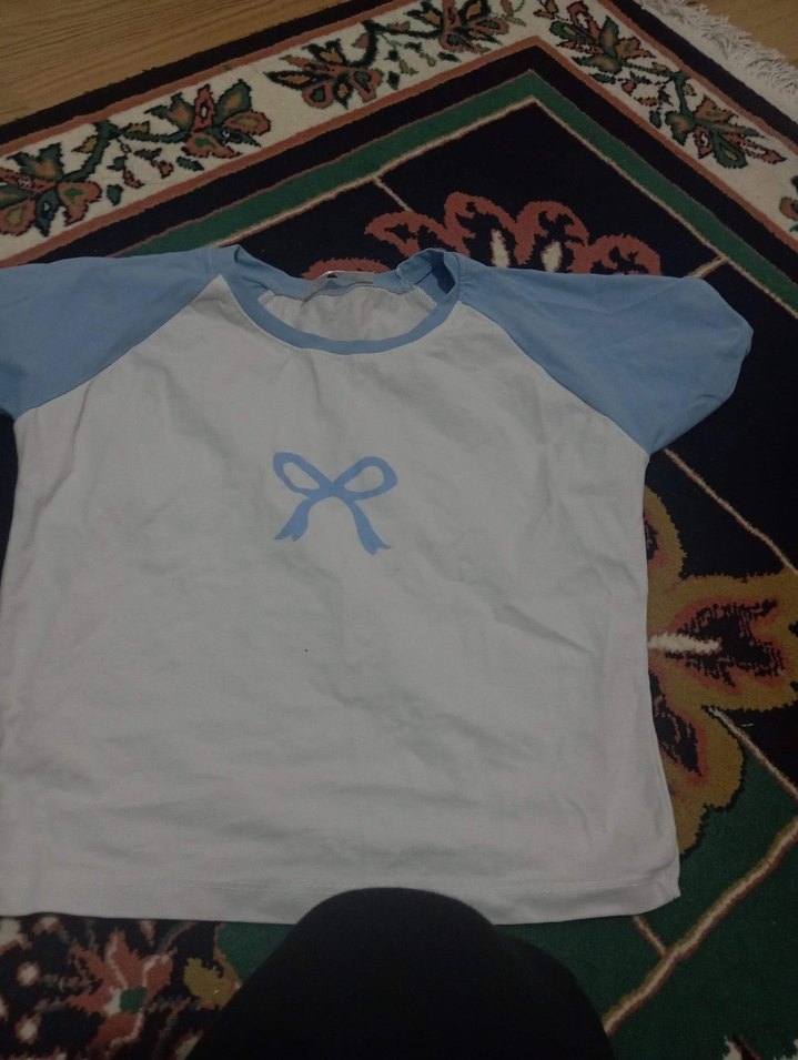 Pamuklu, rahat kesim, kısa kollu tişörtü. Önünde mavi fiyonk baskısı ve yuvarlak yaka bulunur. Günlük kullanım için uygundur.