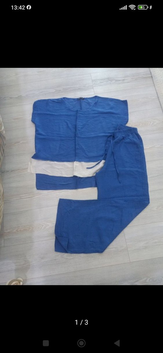 Açık mavi renkte, kısa kollu, bel detaylı, bol kesim ve uzun paçalı. Rahat bir görünüm sunar.