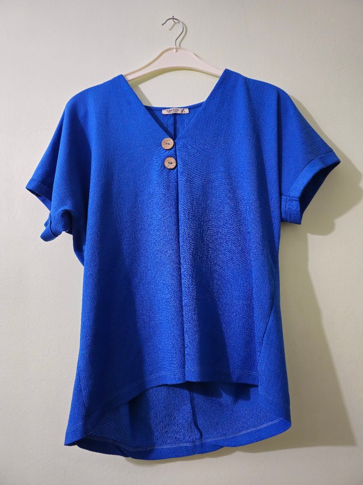 Mavi renkli, keten kumaştan, kısa kollu ve V yakalı, düğmeli, bol kesim bluz. Minimalist ve rahat, günlük kullanım için uygundur. Ürün az kullanılmıştır ve hiçbir kusuru yoktur BEDEN L Alana hayırlı olsun