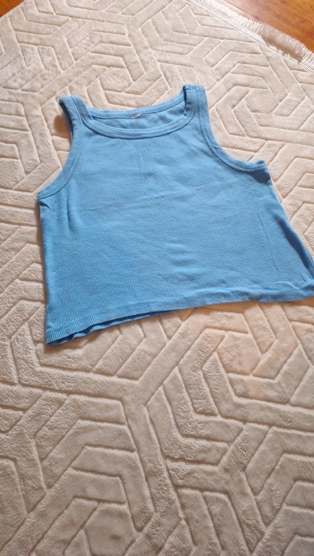 Pamuklu, kısa kesim, mavi renkli, bisiklet yaka, kolsuz ve vücuda oturan kadın atlet. Rahat ve sade günlük kullanım için uygundur.