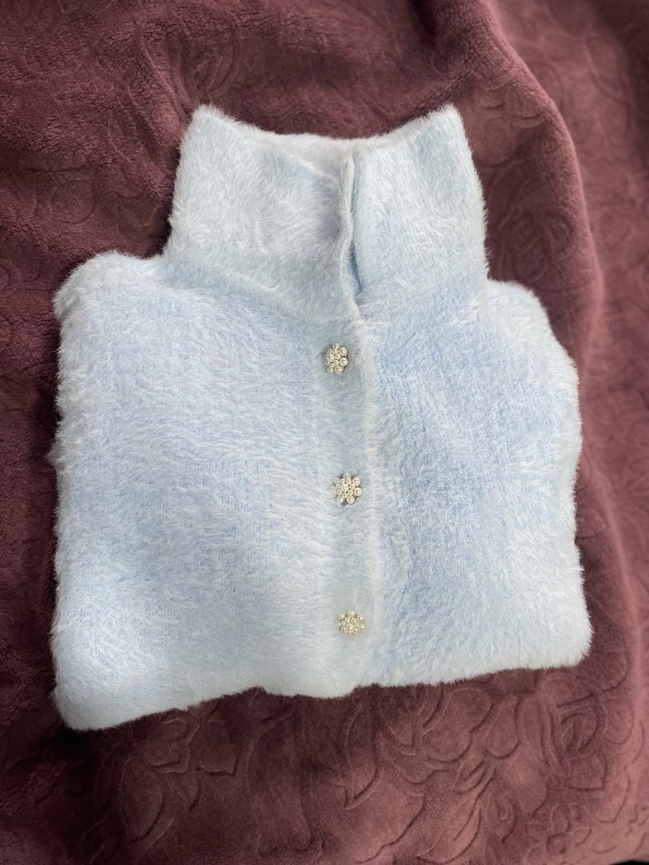 Mavi renkli, yakalı, peluş detaylı ve nakışlı kısa kesim kadın kazak. Uzun kollu, dar kesim, trend sokak tarzı için uygun.