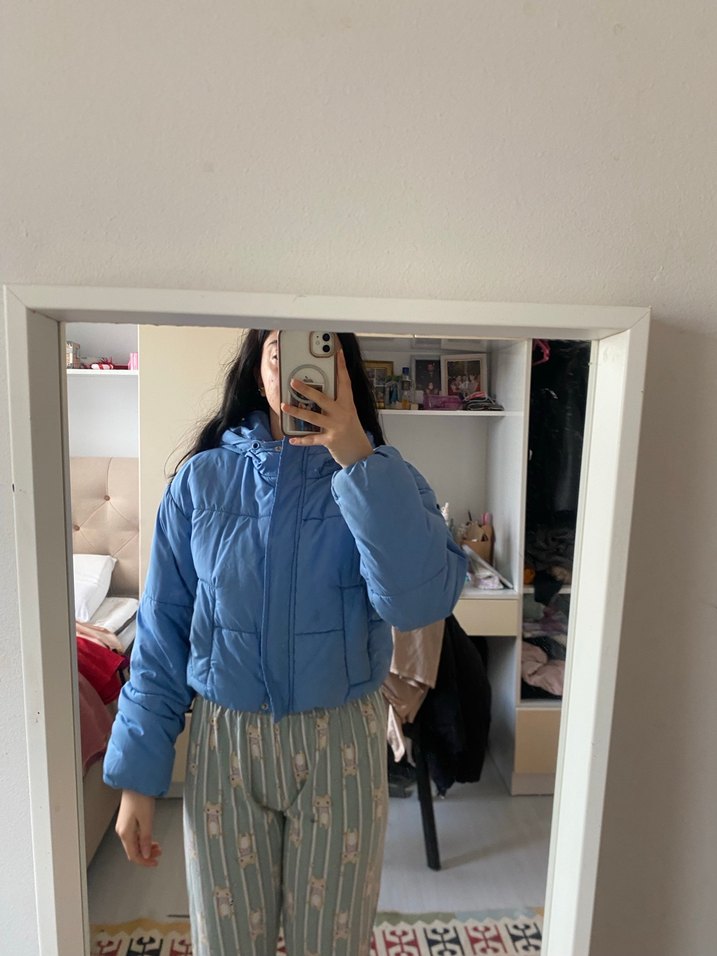 Pastel mavi renkli, yüksek yakalı ve uzun kollu, şişme kısa kesim kadın mont. Sıcak tutan yumuşak dokusu ve rahat kesimiyle günlük kullanıma uygundur.