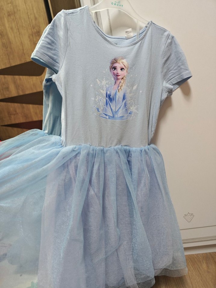 Pastel mavi renkli, baskılı ve fırfırlı etekli kız çocuk elbisesi. Kısa kollu ve yuvarlak yakalı, yumuşak sentetik kumaştan üretilmiştir.