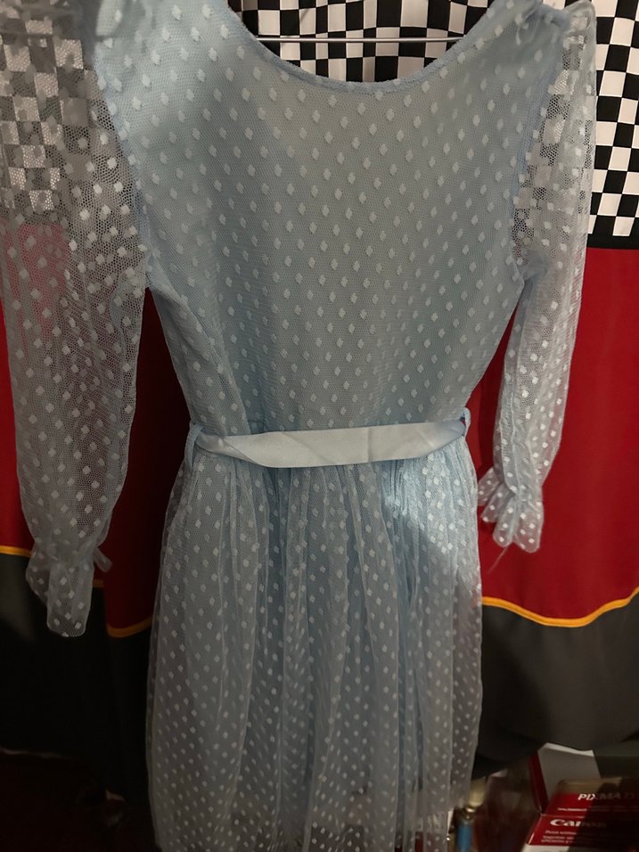 Mavi renkte, sentetik kumaştan yapılmış kız elbisesi, uzun kollu, V yakalı ve pileli detaylara sahip bohem tarzda, vücuda oturan kesim.