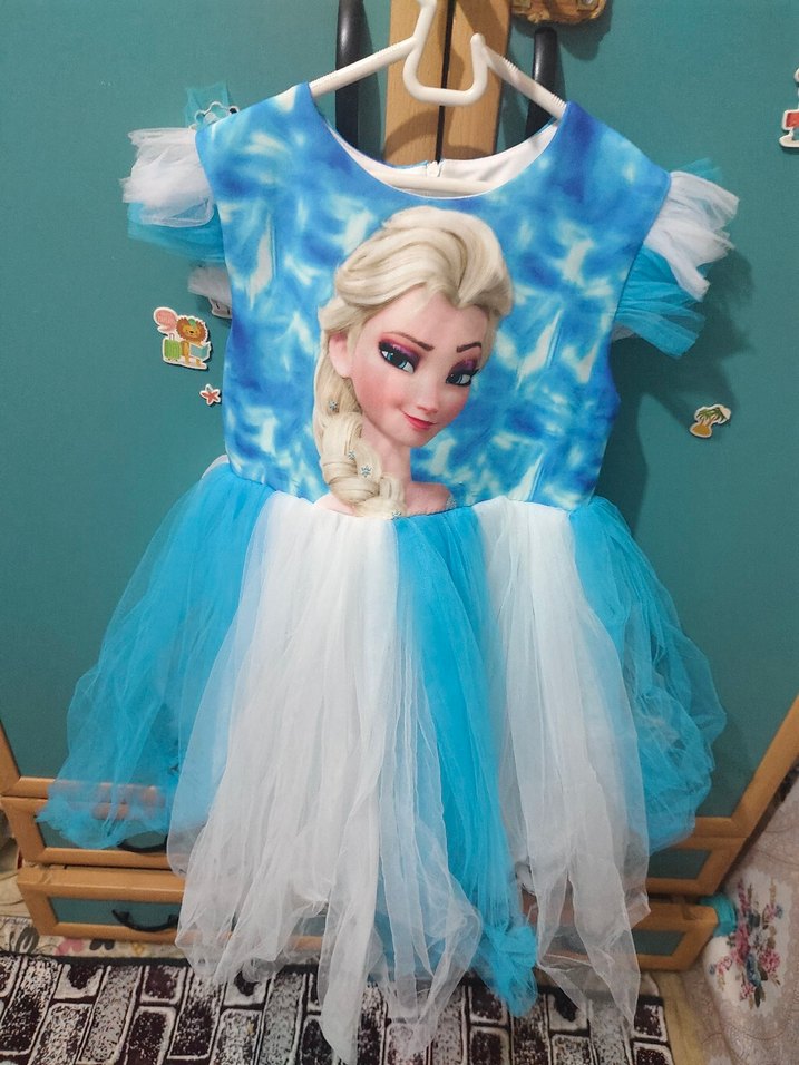 Renkli Elsa baskılı, kısa fırfırlı kollu, katmanlı tül etekli mavi kız çocuk elbisesi.