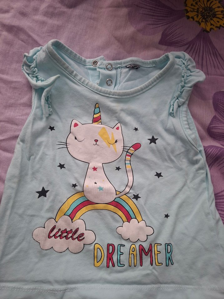 Pamuklu mavi, askısız ve fitted kesim kız çocuk tişörtü. Omuzlarda fırfır detayları bulunur. Üzerinde gökkuşağı ve yıldızlarla süslenmiş unicorn kedi baskısı ve 'little DREAMER' yazısı vardır. az kullanılmış temiz 18 aya kadar uygundur.