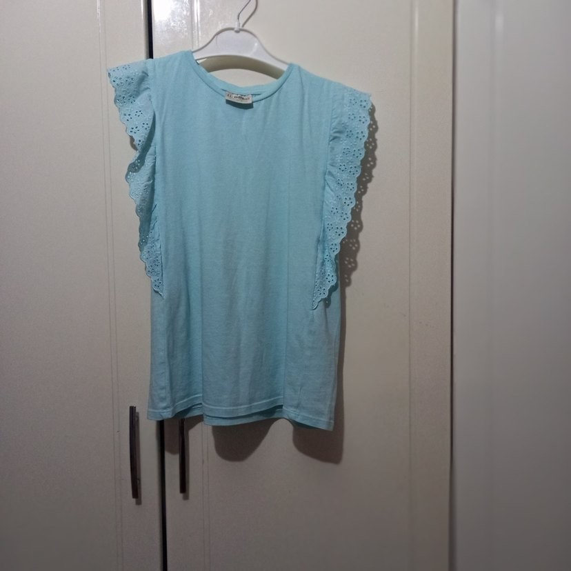 Mavi pamuklu, kısa kollu, fırfırlı detaylı ve yuvarlak yakalı kız çocuk tişörtü. Rahat kesimiyle günlük sokak stiline uygundur. iki kol arası 32 uzunluk 50 cm
