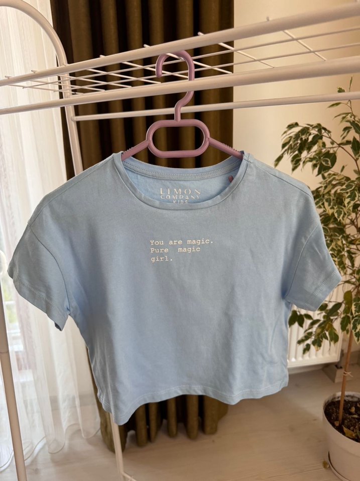 Mavi renk, kısa kollu, pamuklu ve bol kesim kız çocuk tişörtü. Önünde 'magic' yazılı baskı ile rahat ve şık bir stil sunar. ✨