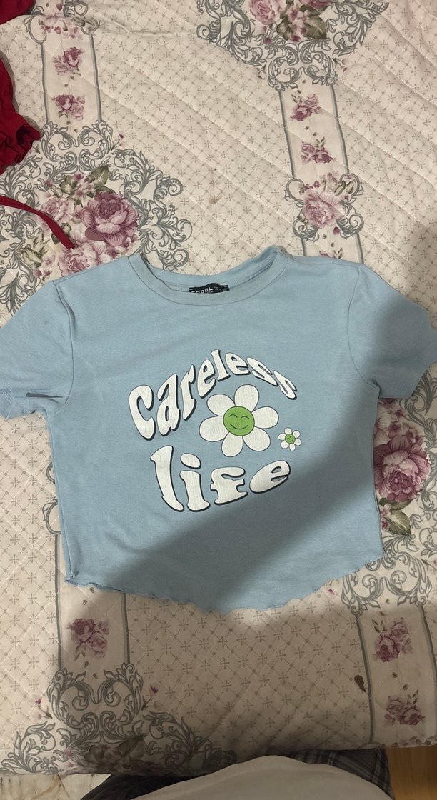 Pamuklu, pastel mavi renkte, kısa kollu ve yuvarlak yakalı kız tişörtü. Baskılı tasarımı ve bol kesimiyle rahat bir stil sunar.
