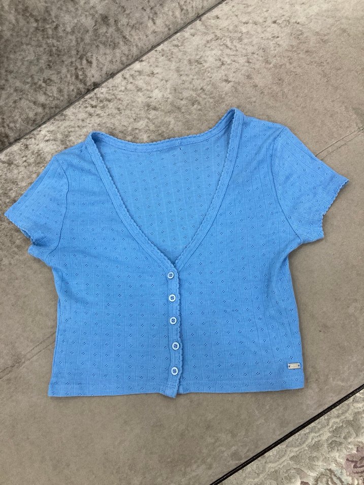 Mavi pastel renkte, V yaka ve düğmeli ön kısmı olan, yumuşak triko kumaştan yapılmış, kızlar için fitted kesim kısa kollu üst. Trendy casual ve street wear tarzına uygun.