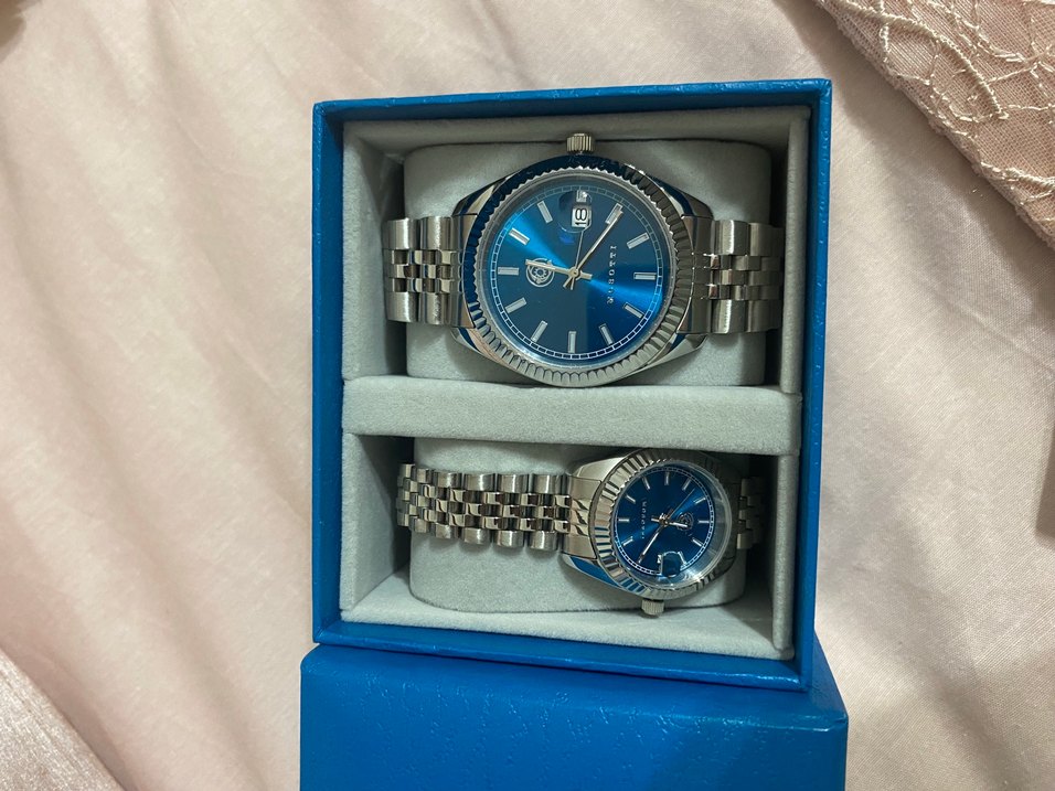 İki adet mavi kadranlı kadın saati seti, gümüş renkli metal kordonlu ve tarih göstergeli, modern klasik tasarıma sahip. ⌚