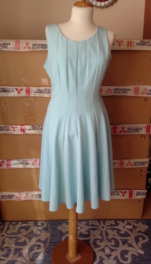 Pastel mavi renkte, V yakalı ve pilili detaylara sahip askısız midi elbise. Düz sentetik kumaştan, ofis için uygun modern klasik tarzda, rahat kesim.40 beden kloş elbise sorunsuz tertemiz/ arkadasimin