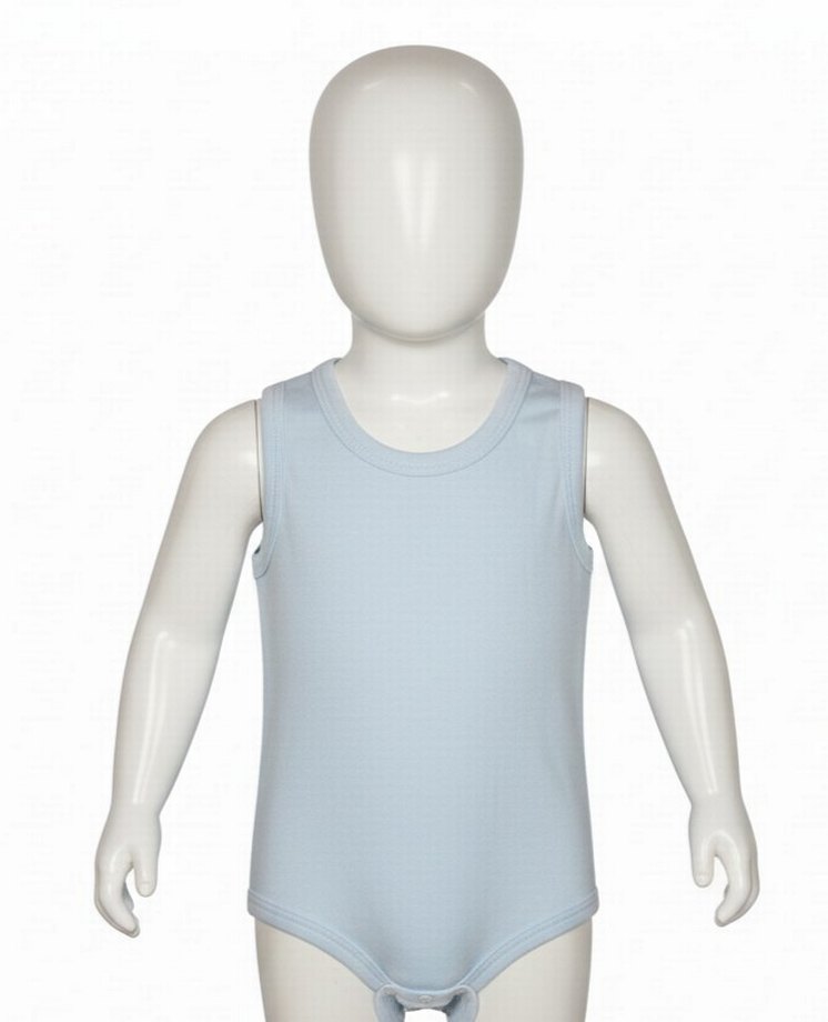 Pastel mavi renkte, kolsuz ve yuvarlak yaka bebek body. Yumuşak sentetik kumaştan, desensiz sade tasarım.
