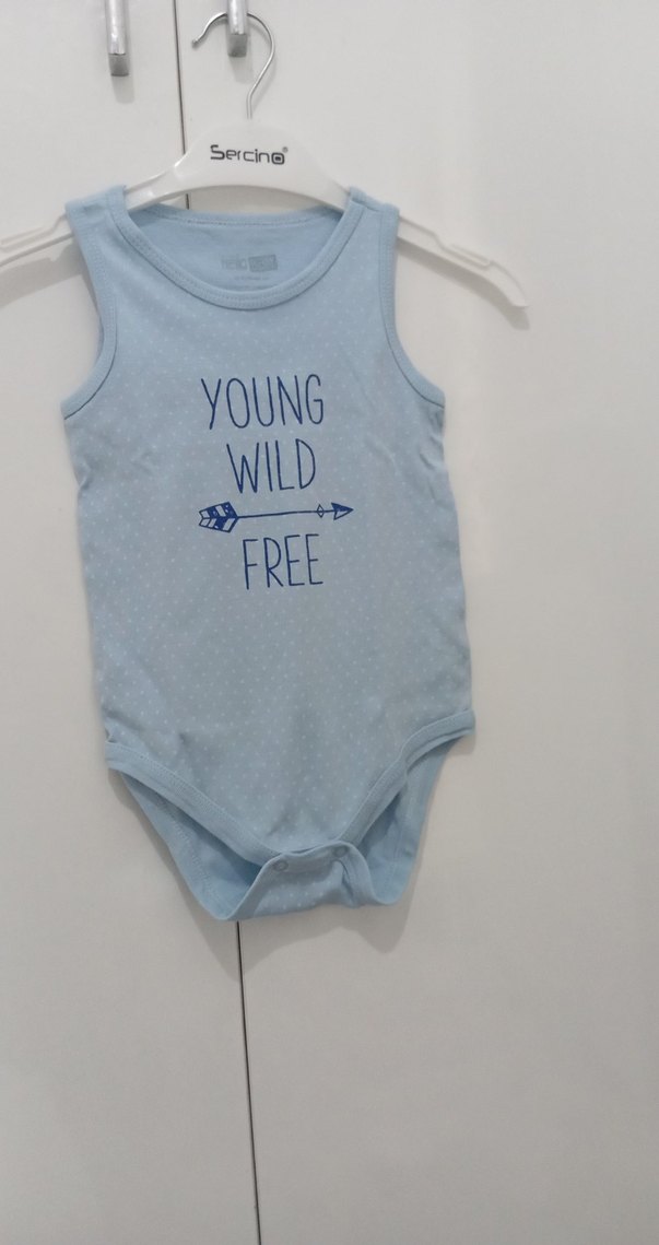 Kolsuz, straplez mavi bebek body, "YOUNG WILD FREE" yazılı baskılı. Yumuşak ve sıcak kumaştan, sokak tarzı şıklığında.