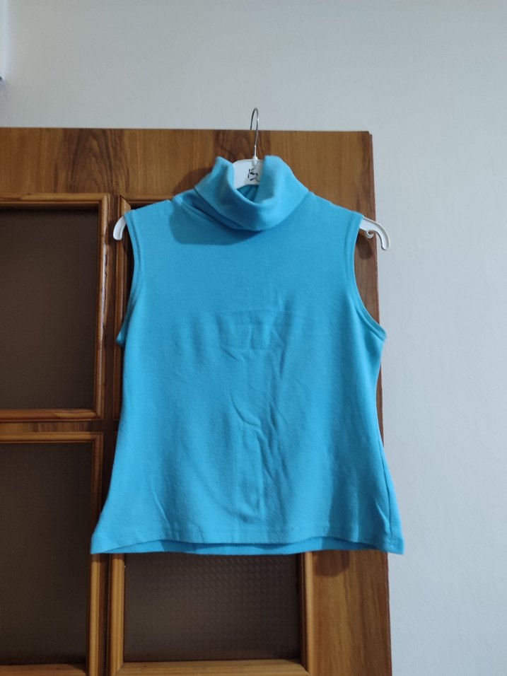 Kolsuz, boğazlı ve vücuda oturan mavi bluz. Yumuşak kumaştan, pastel tonuyla gündelik ve athleisure tarzlara uygun.