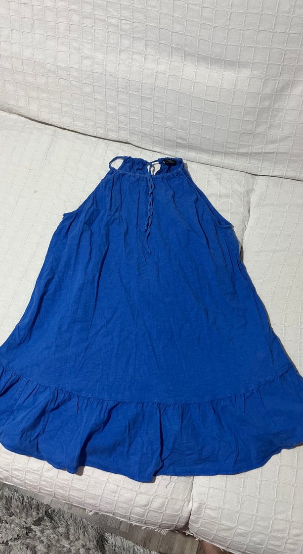 Mavi keten kumaştan, kolsuz, yüksek yakalı ve volan detaylı midi elbise. Rahat kesimi ve minimalist tarzı günlük kullanıma uygundur. Xs yazıyor ama bence s bedene de olur