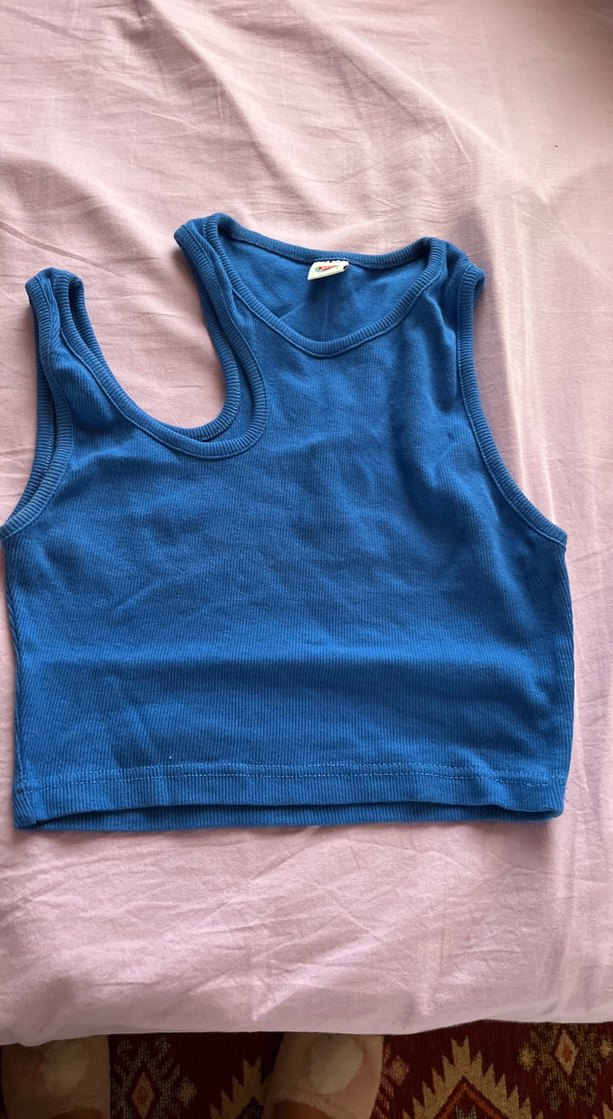 Mavi renkli, kolsuz ve straplez kesime sahip denim atlet. Orta uzunlukta, vücuda oturan kesimiyle günlük kullanım için rahat ve şık bir seçim.