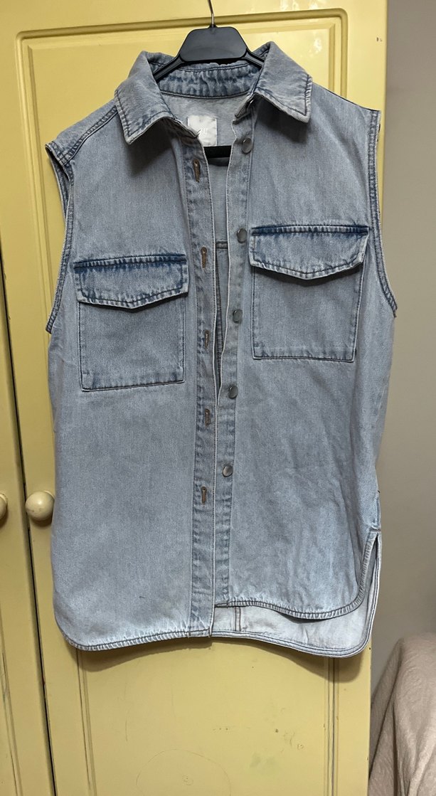 Mavi kolsuz denim ceket, düğmeli ön ve yakalı tasarıma sahiptir. İki göğüs cebli, rahat kesim ve günlük sokak modasına uygundur.