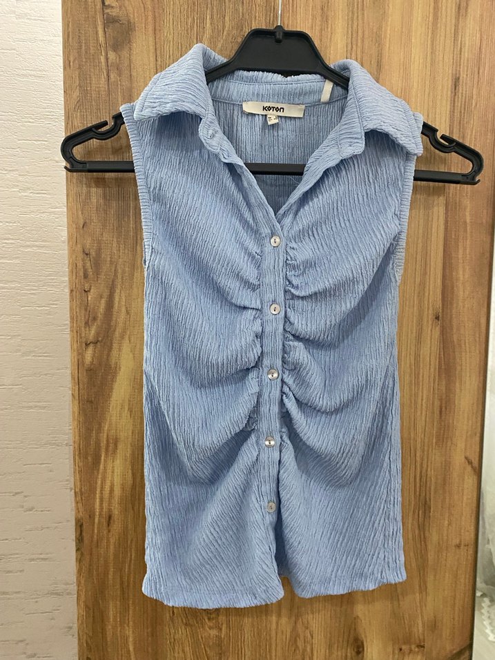 Yumuşak keten kumaştan, düğmeli ve yakalı mavi kolsuz gömlek. İnce kesimi ve hafif batik deseniyle günlük kullanıma uygun.