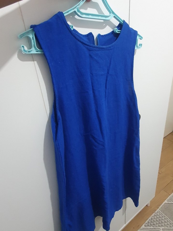 Keten kumaştan, kolsuz ve bol kesimli mavi elbise. Drapeli tasarımı, yuvarlak yakası ve midi uzunluğu ile gündelik kullanıma uygundur. ✨