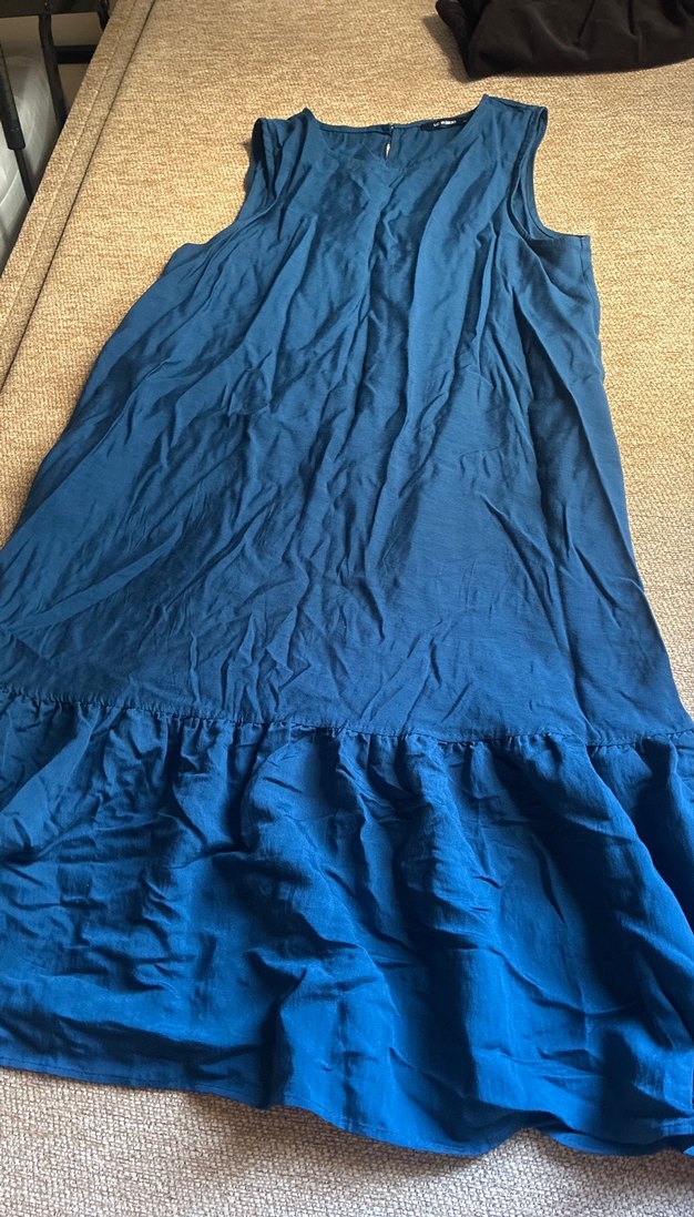 Koyu mavi renkli, kolsuz standart kalıp keten kumaştan, bol kesim ve etek ucunda volan detaylı uzun eteği. Bohem tarzıyla günlük kullanıma uygundur.