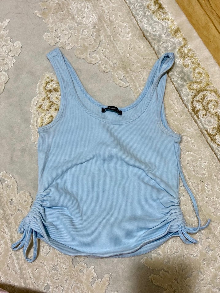 Mavi, kolsuz ve fit kesim kadın atlet, yumuşak keten kumaştan. Yanlarda büzgü detayı ile şık bir görünüm sunar. Günlük sokak stiline uygun.