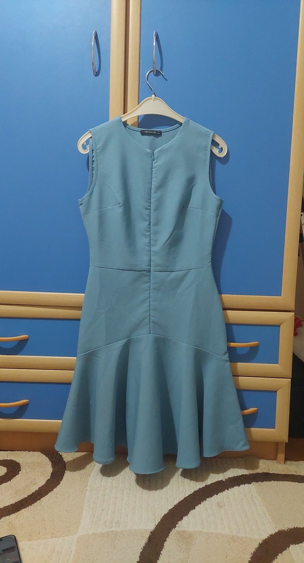 Mavi, kolsuz midi elbise, oturan kesim ve pileli etek ucu ile. Askısız yakaya sahip, minimal desenli ve gündelik kullanım için uygun.