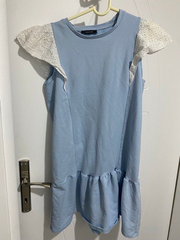 Pastel mavi, kolsuz midi elbise, omuzlarda ve etek ucunda fırfır detaylıdır. Yuvarlak yakalı ve yumuşak sentetik kumaştan yapılmıştır, günlük rahat kullanım için uygundur.