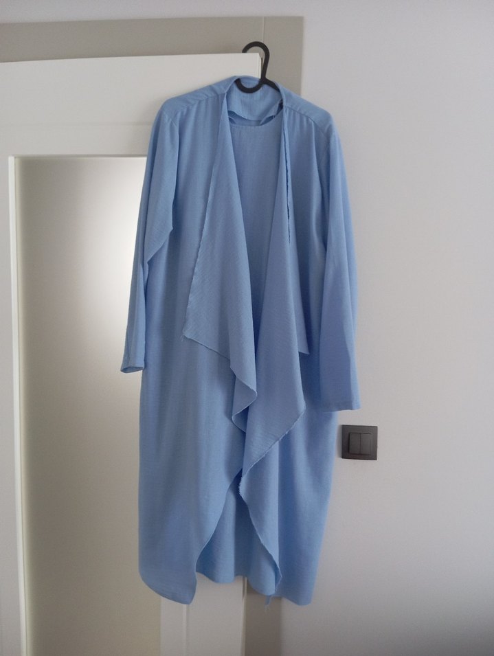 Pastel mavi renkte, kolsuz ve yüksek yakalı hamile tunik. Yumuşak keten kumaştan, bol kesim ve drapeli, günlük kullanım için uygundur.