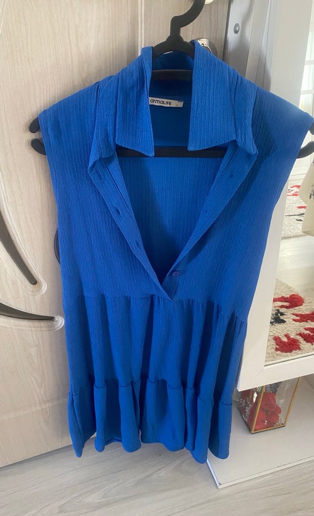 Mavi kolsuz midi elbise, yumuşak keten kumaştan, pilili detaylı ve yakalı, rahat kesimle günlük sokak stiline uygun.