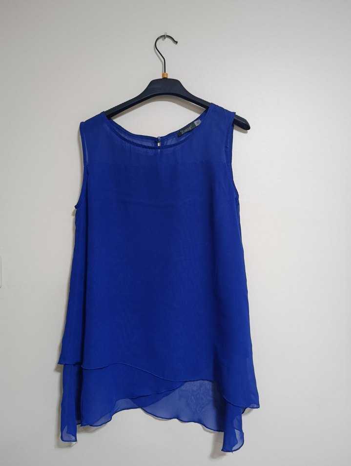 Mavi renkli, kolsuz, yuvarlak yakalı bluz. Parlak ve ipeksi dokusuyla, salaş ve drapeli kesime sahip, mini boyda, minimalist tasarım.
