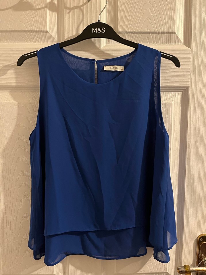 Koyu mavi renkte, kolsuz, salaş kesim ve drapeli tasarıma sahip bir bluz. İnce ve ipeksi kumaştan üretilmiş, günlük kullanıma uygun sade bir model.