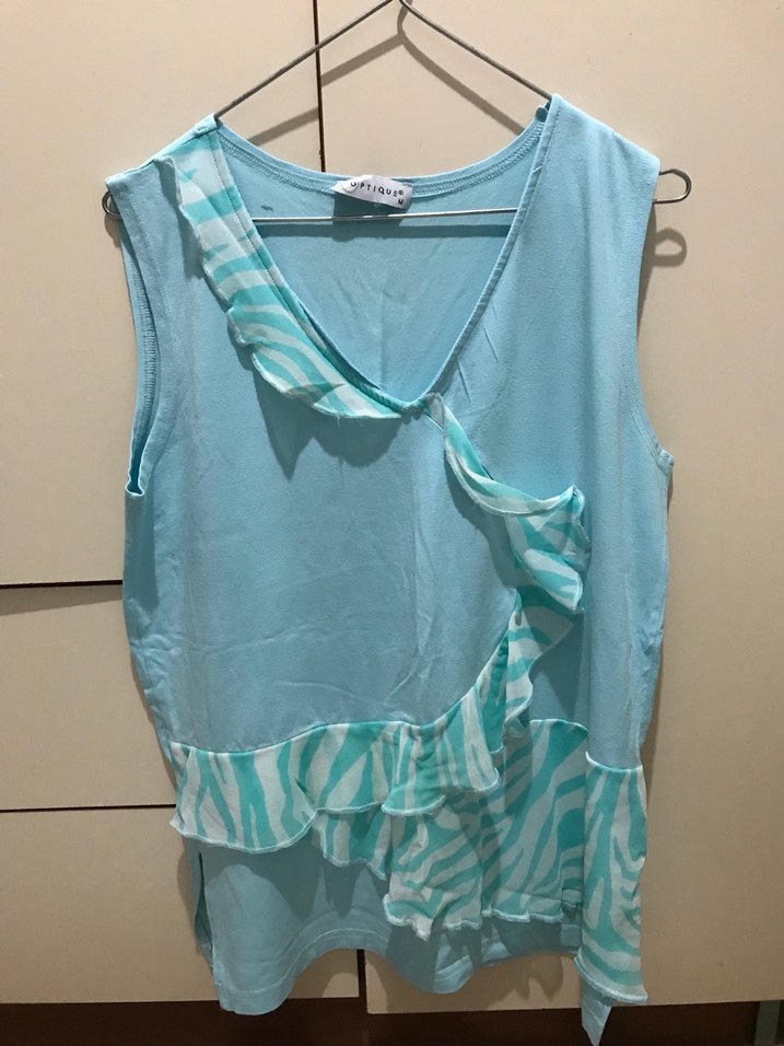 Mavi kolsuz bluz, V-yaka ve fırfır detaylı. Pastel tonlarda batik desenli, kısa ve bol kesim, günlük rahat stil için uygun.