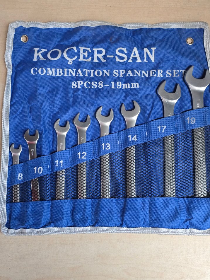 Mavi kumaş kılıf içinde 8-19mm arası 8 adet renkli kombin anahtar seti. KOÇER-SAN markalı, kullanışlı ve düzenli saklama sağlar.