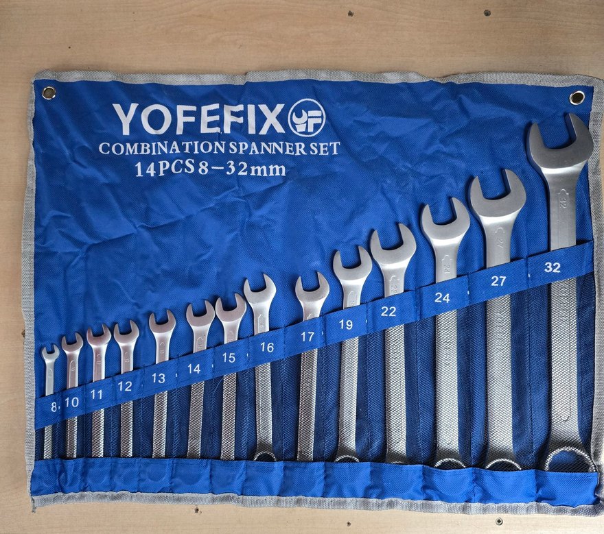 8-32mm arası 14 parçadan oluşan, çeşitli boyutlarda mavi kombin anahtar takımı. Boyutlar mavi kumaş kılıf üzerinde belirtilmiştir. ️