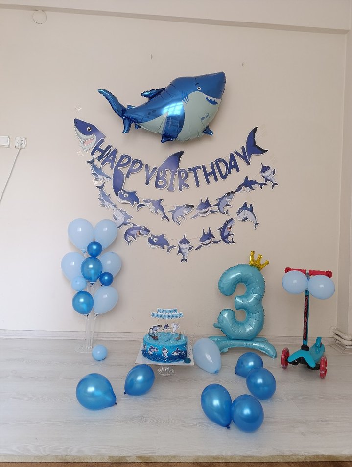 Mavi köpek balığı temalı balonlar, Happy Birthday yazılı süsleme ve taçlı 3 numara balonuyla çocuk doğum günü partisi için uygundur.
